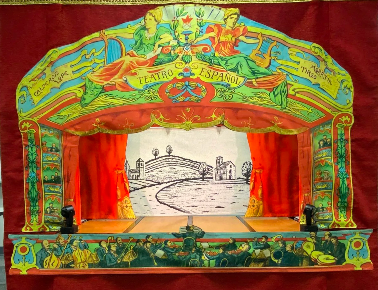 The design of our front curtain takes inspiration from the historic and beautifully elaborate tapestry featured in the actual Teatro Español in Madrid. With the pull of a cord, the curtain raises and lowers to provide the puppet show with a properly grand entrance and exit!