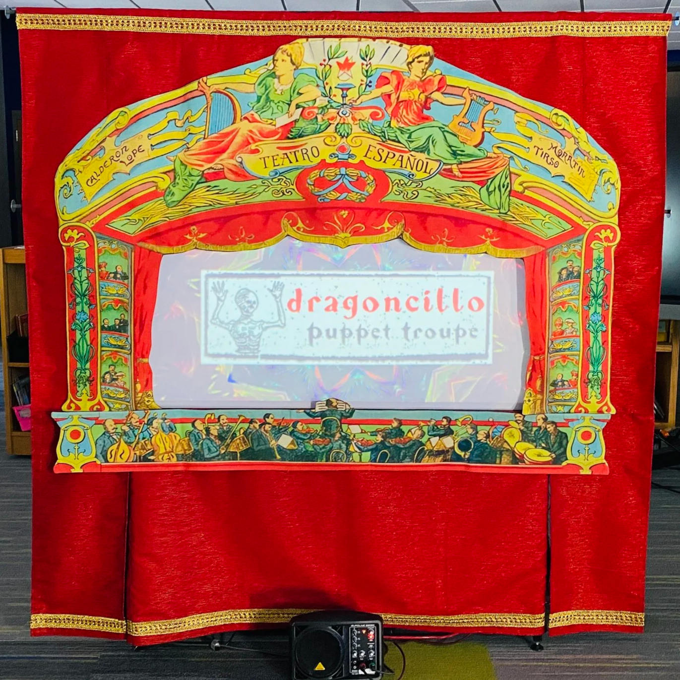Dragoncillo’s largest shadow puppet stage, developed and maintained by Jason Yancey, uses a projection screen (8’2” tall and 9’6” wide) that is set up for video and sound, and requires a single power outlet for electricity. The equipment is self-contained, travels entirely in a couple of suitcases, and adapts readily to available spaces.